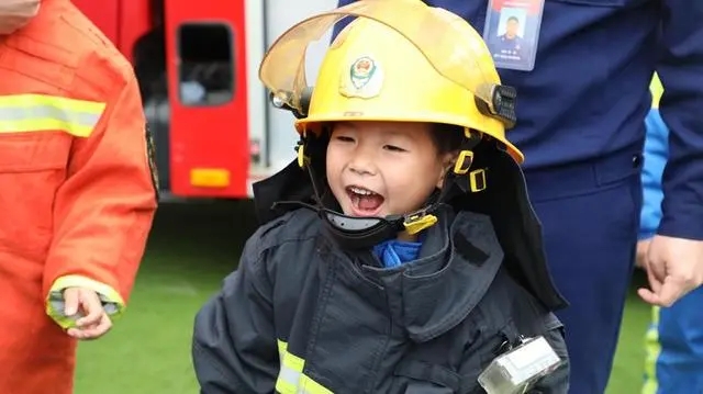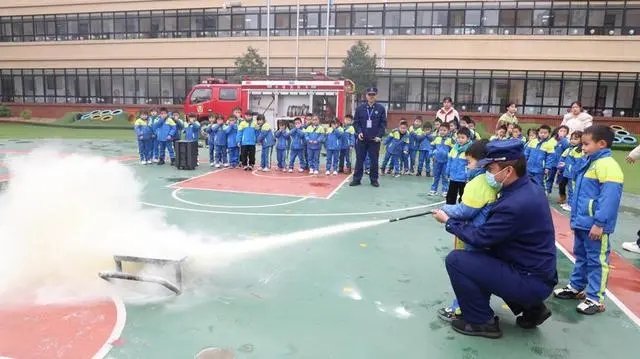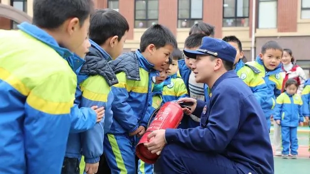 幼兒園小朋友向消防員咨詢滅火器的使用方法。藍永貴攝